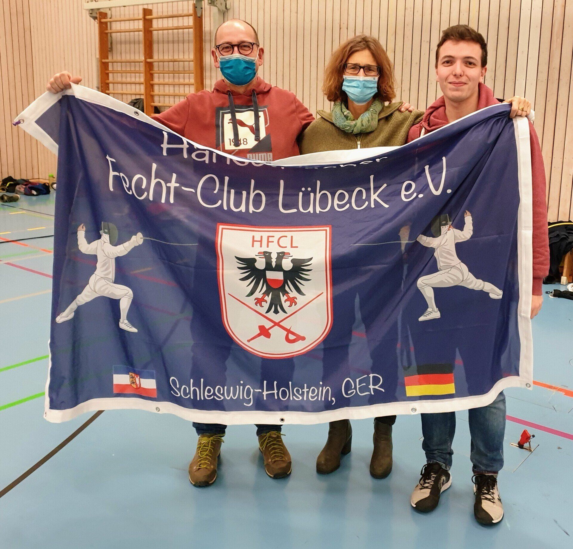 Eine schöne, lebhafte Weihnachtsparty hatte der HFC Lübeck da auf die Beine gestellt. Nach dem zwangsweisen Wegfall der traditionellen Feier im letzten Jahr, wurde das diesjährige Event umso freudiger begrüßt – vor allem der Fechtnikolaus. Dieser hatte wieder für alle kleinen und großen Fechter, Vorstand und Eltern seinen großen Weihnachtssack gepackt und auch diesmal keine Probleme, den Inhalt bei den Anwesenden loszuwerden. Über ein ganz besonderes Geschenk freuten sich auch die Zuckerabstinenzler. Der Nikolaus packte eine nigelnagelneue HFCL-Flagge aus – eigens von ihm kreiert und in Auftrag gegeben. Dieses Schmuckstück wird nun immer - zusammen mit den anderen Flaggen - bei den Heimturnieren - in der Halle hängen und bei Auswärtsturnieren mitgenommen, um die „HFCL-Ecke“ mit dem dazugehörigen „Fanblock“ zu markieren.